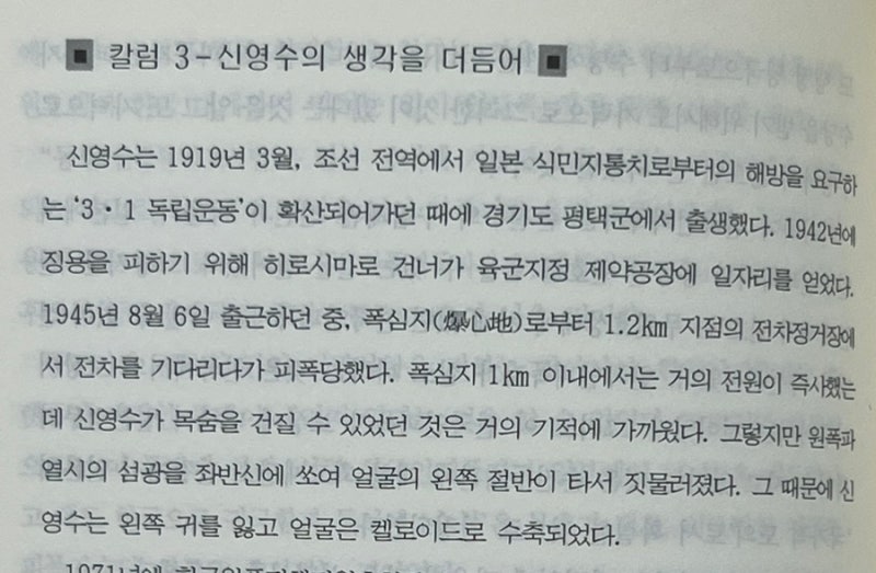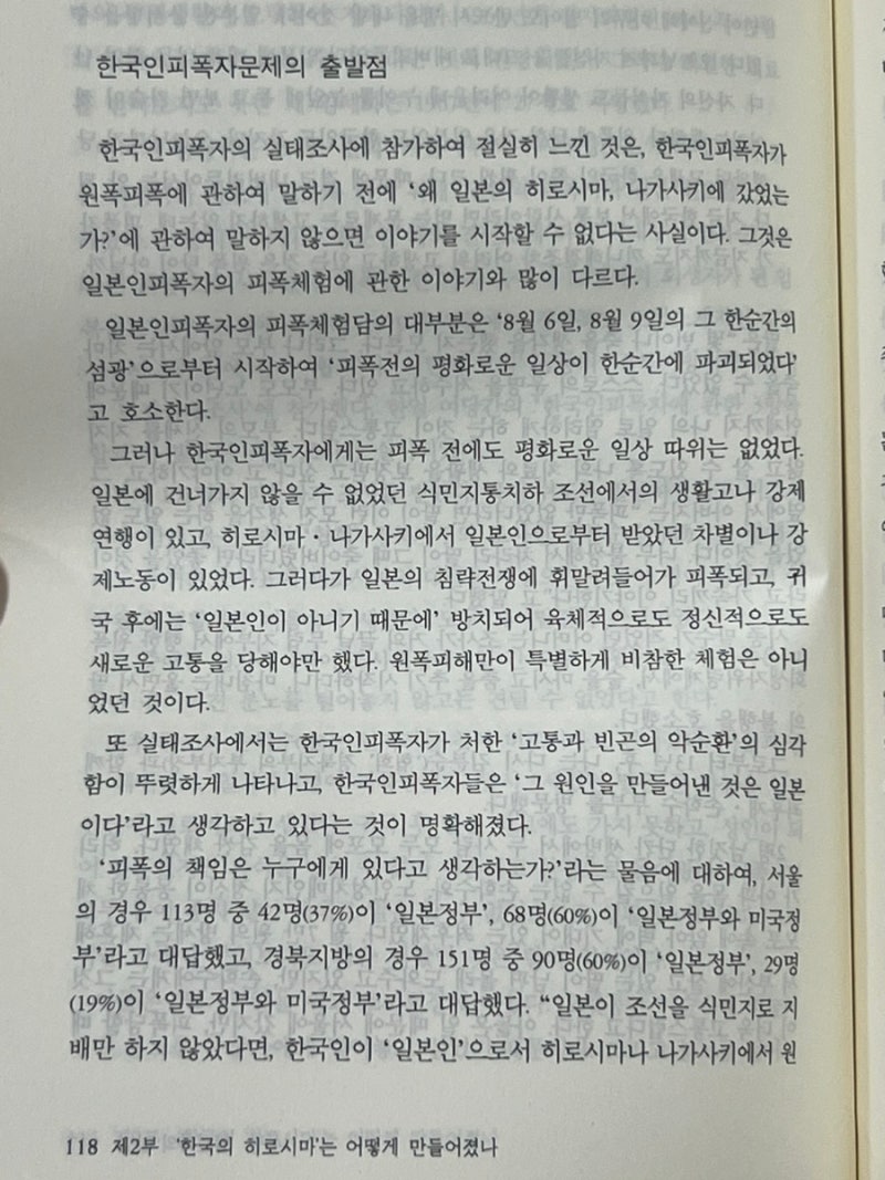 “일본 패전 당시인 1945년 8월엔 240만명 가까운 조선인이 일본에 살고 있었다. 이실근은 “히로시마·나가사키에서 생활한 조선인은 ‘원자폭탄’을 맞아 두 도시 합쳐 약 7만명이 피폭, 4만 수천 명이 희생되었다”고 쓴다.”