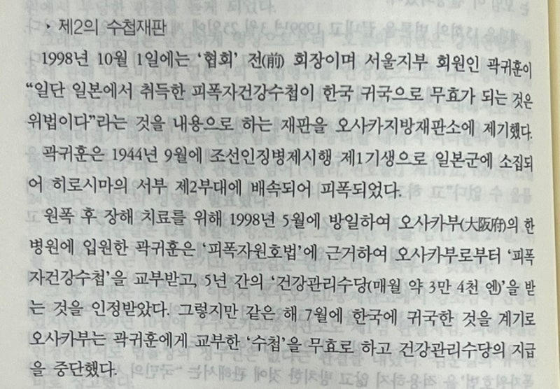 1998년 10월 1일에는 ‘협회' 전 회장이며 서울지부 회원인 곽귀훈이 “일단 일본에서 취득한 피폭자건강수첩이 한국 귀국으로 무효가 되는 것은 위법이다”라는 것을 내용으로 하는 재판을 오사카지방재판소에 제기했다.