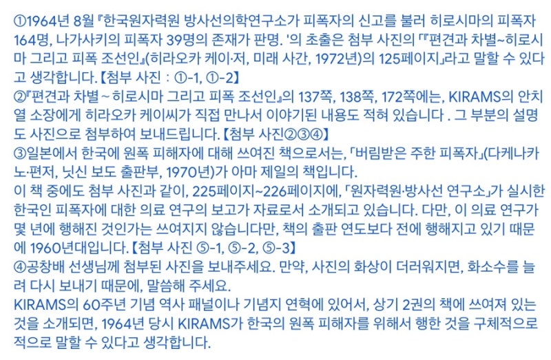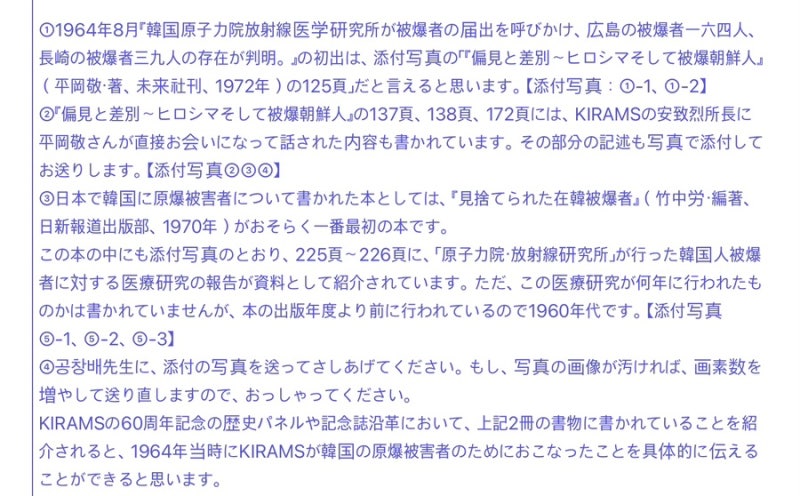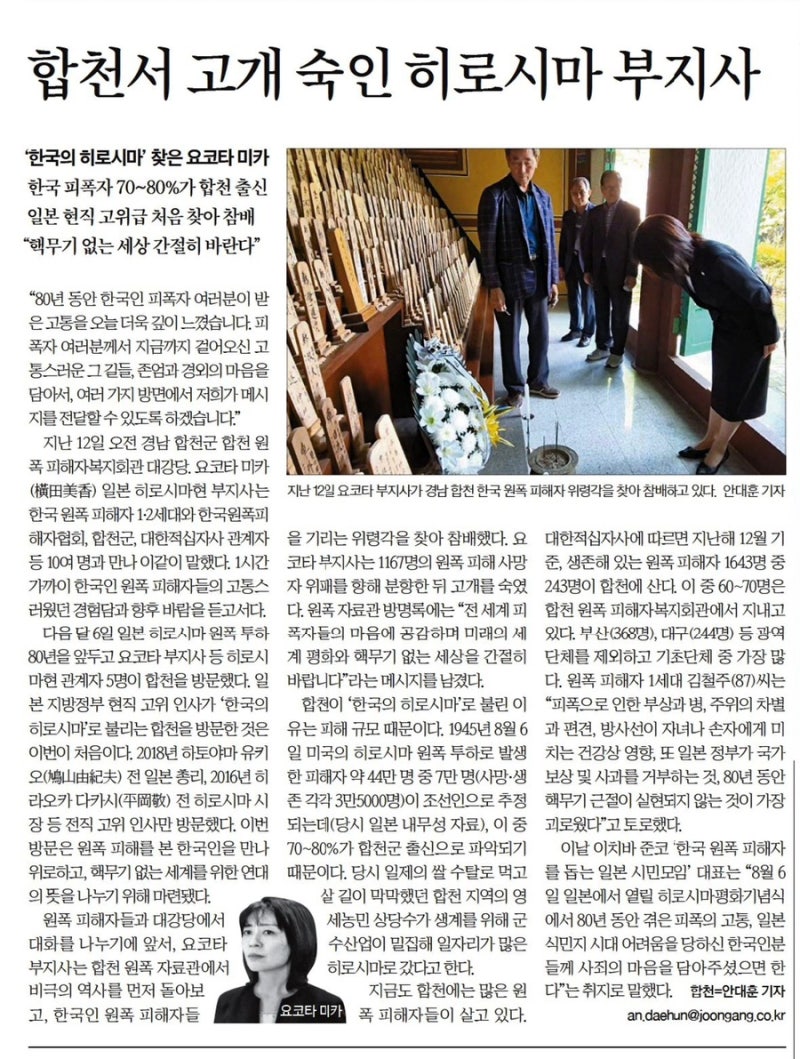 “이날 이치바 준코 ‘한국 원폭 피해자를 돕는 일본 시민모임’ 대표는 “8월 6일 일본에서 열릴 히로시마평화기념식에서 80년 동안 겪은 피폭의 고통, 일본 식민지 시대 어려움을 당하신 한국인분들께 사죄의 마음을 담아주셨으면 한다”는 취지로 말했다.”