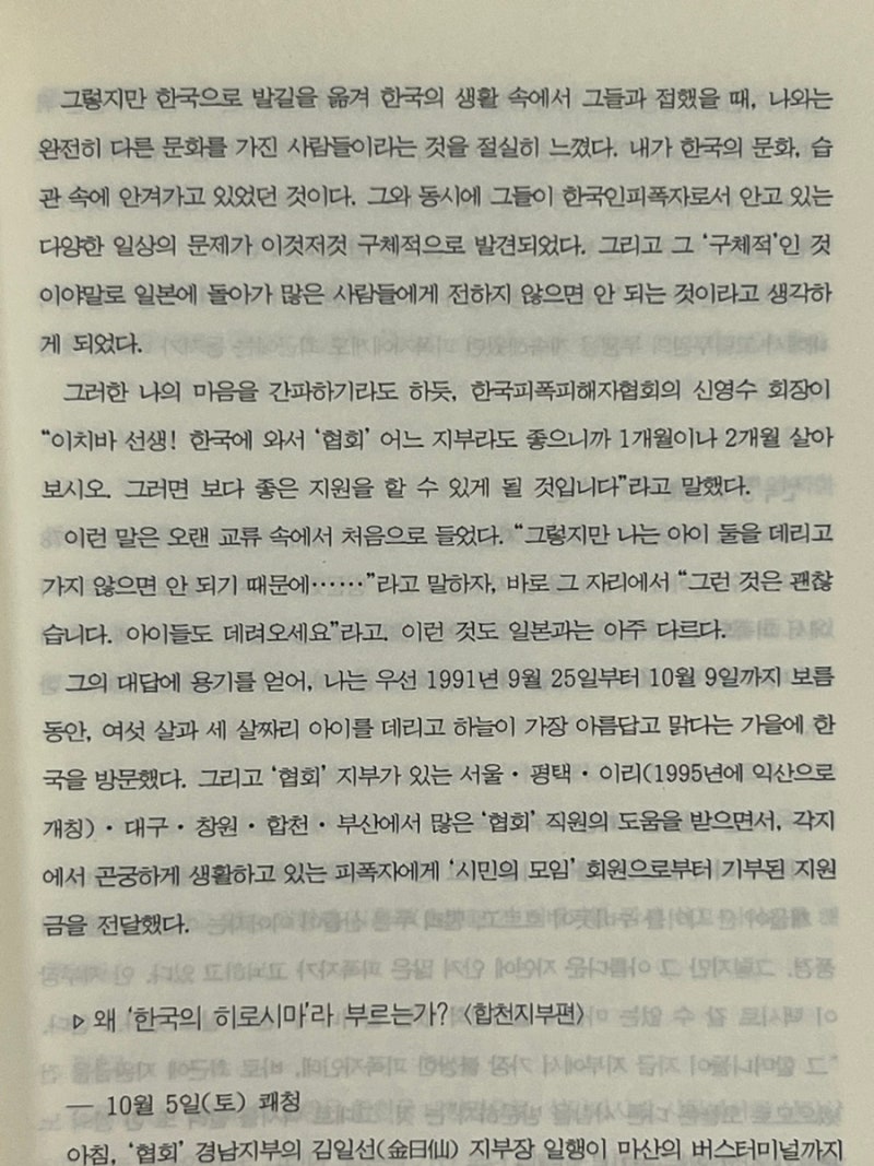 한국으로 발길을 옮겨 한국의 생활 속에서 그들과 접했을 때, 나와는 완전히 다른 문화를 가진 사람들이라는 것을 절실히 느꼈다. 내가 한국의 문화, 습관 속에 안겨가고 있었던 것이다. 그와 동시에 그들이 한국인피폭자로서 안고 있는 다양한 일상의 문제가 이것저것 구체적으로 발견되었다. 그리고 그 '구체적'인 것이야말로 일본에 돌아가 많은 사람들에게 전하지 않으면 안 되는 것이라고 생각하게 되었다.