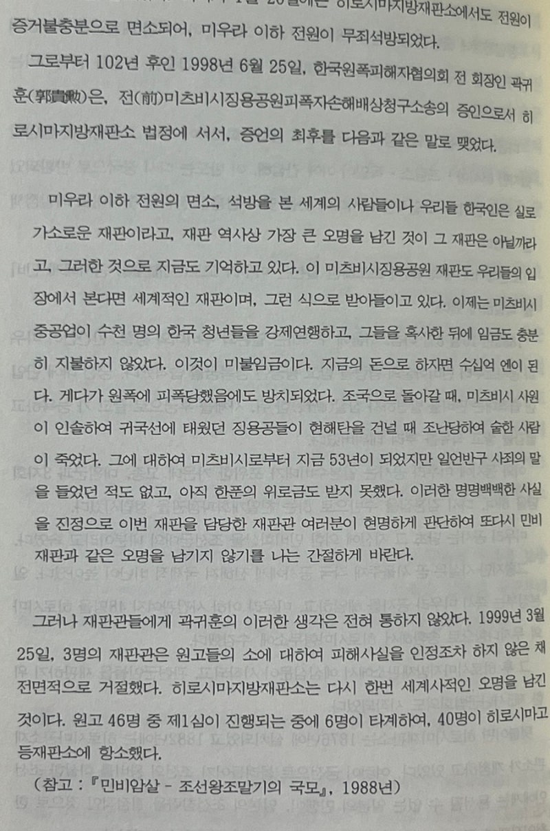 그로부터 102년 후인 1998년 6월 25일, 한국원폭피해자협의회 전 회장인 곽귀훈은, 전 미츠비시장용공원피폭자손해 배상청구소송의 증인으로서 히로시마지방재판소 법정에 서서, 증언의 최후를 다음과 같은 말로 맺었다.