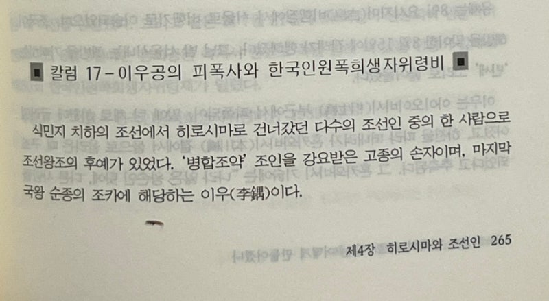“애초 위령비는 고종 손자인 이우 공이 원폭으로 숨진 지점에 설치됐다. 하지만 이후 공원 밖에 위령비가 있는 것은 한국인 차별이라는 지적이 나왔다. 처음 히로시마시 측은 ‘공원 내에 이미 많은 추모시설이 있다’는 이유로 이전에 난색을 보였다.