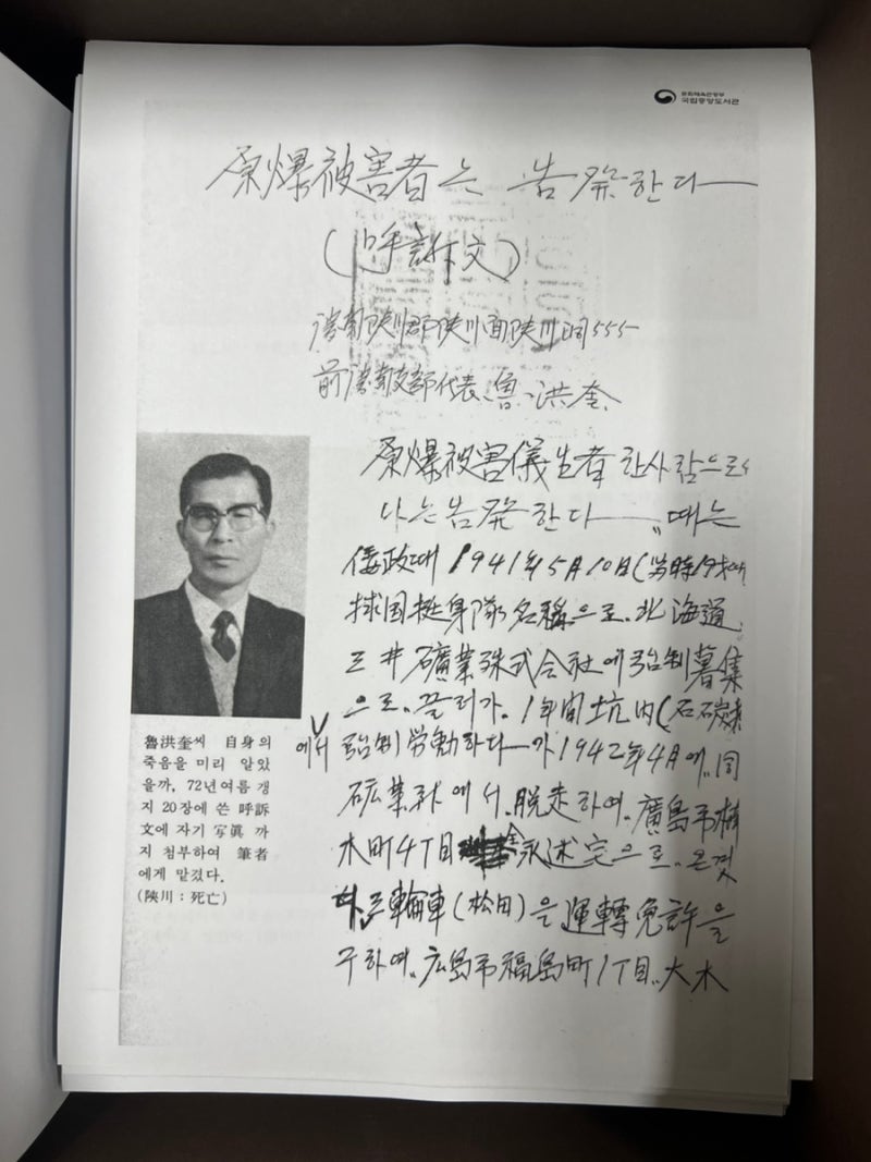 고인은 2005년, 2011년 자신의 소송 기록 및 원폭 피해자 운동 관련 기록을 국사편찬위원회에 기증했다.”