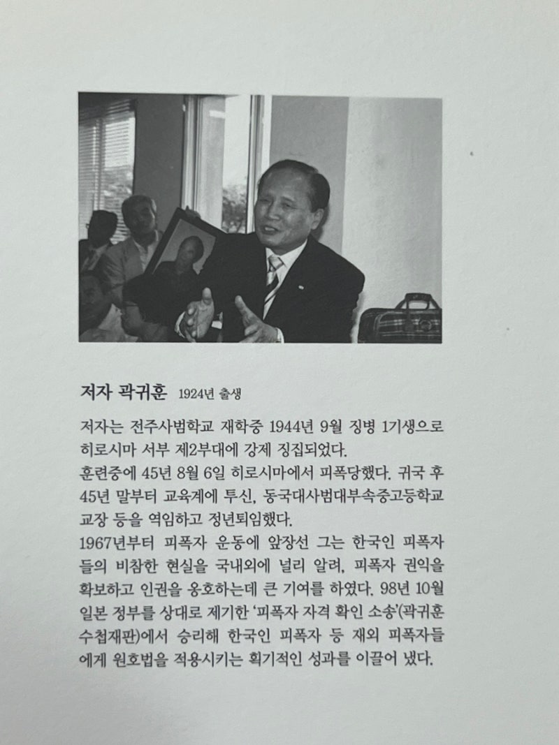 곽귀훈은 1944년 9월에 조선인징병제시행 제1기생으로 일본군에 소집되어 히로시마의 서부 제2부대에 배속되어 피폭되었다.