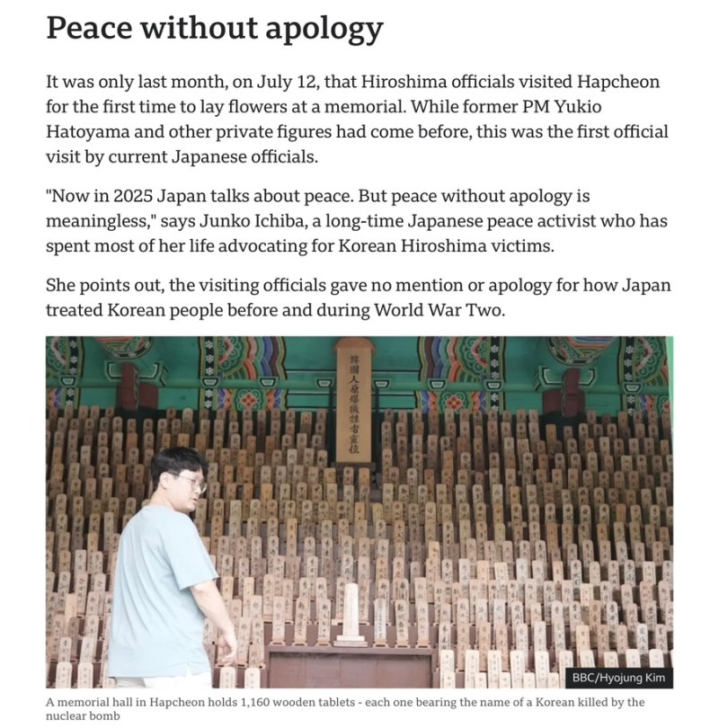 "Now in 2025 Japan talks about peace. But peace without apology… is says Junko Ichiba, a long-time Japanese peace activist who has spent … of her life advocating for Korean Hiroshima victims.