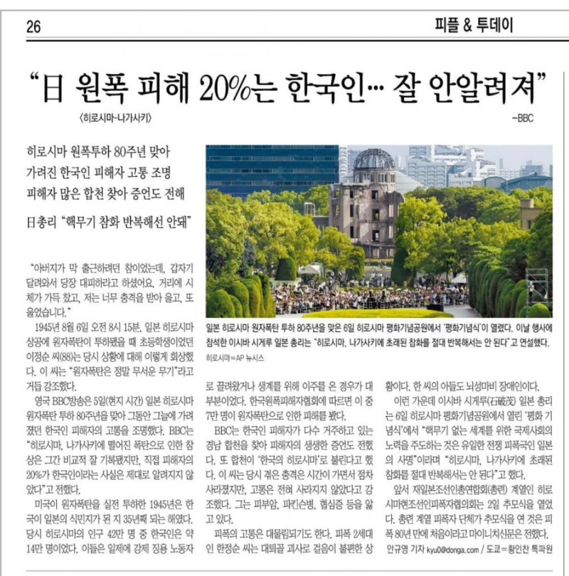 “영국 BBC방송은 5일(현지 시간) 일본 히로시마 원자폭탄 투하 80주년을 맞아 그동안 그늘에 가려졌던 한국인 피해자의 고통을 조명했다. BBC는 “히로시마, 나가사키에 떨어진 폭탄으로 인한 참상은 그간 비교적 잘 기록됐지만, 직접 피해자의 20%가 한국인이라는 사실은 제대로 알려지지 않았다”고 전했다.