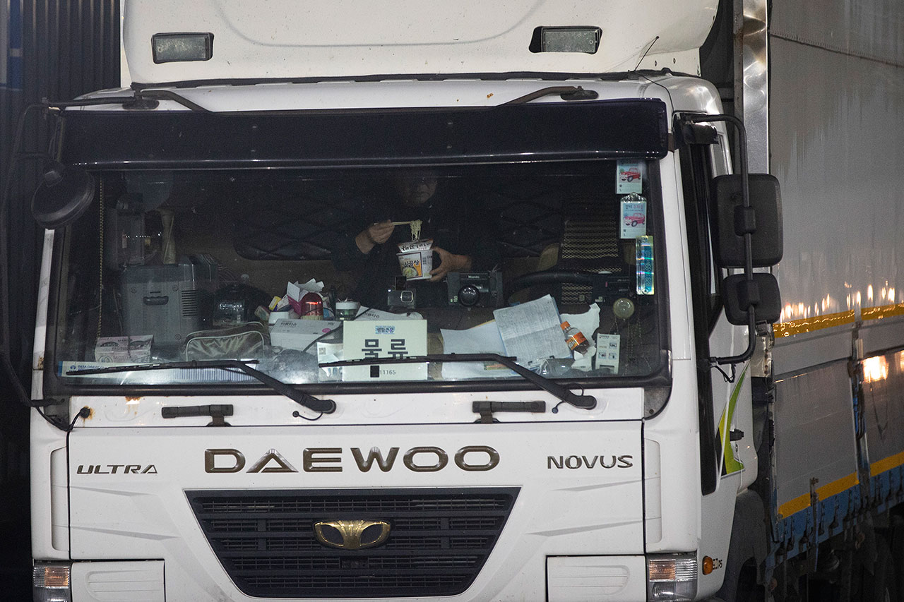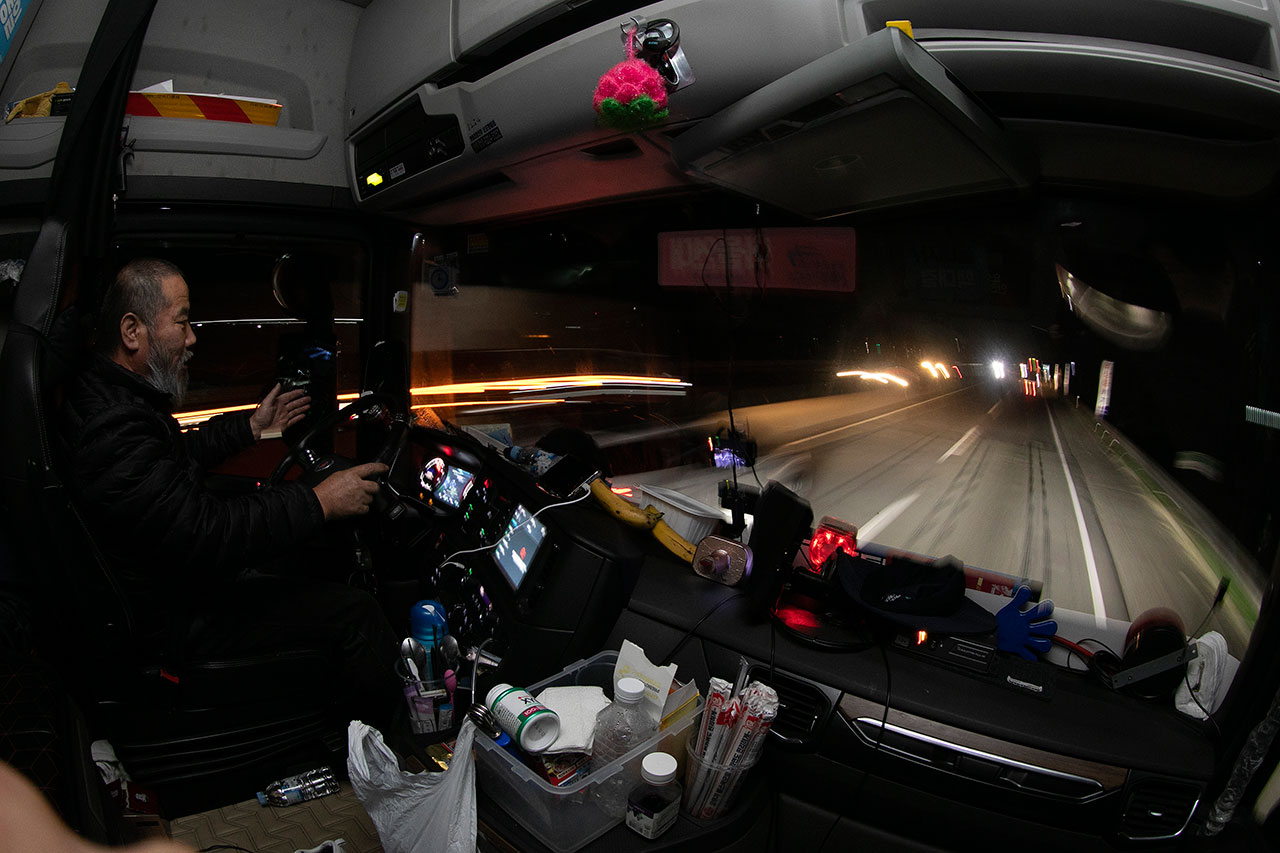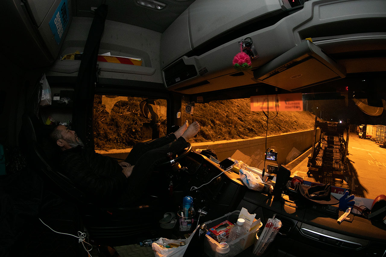 김씨가 차량 시동을 끄고 눈을 붙인 건 〈시사IN〉 기자가 동행한 24시간 가운데 단 1시간 정도뿐이었다. 10월18일 새벽 3시경, 경기도 군포에서 연결한 샤시를 끌고 충북 옥천 허브터미널로 향하던 중간, 경부고속도로 하행선 천안호두휴게소에 들러 잠시 쪽잠을 잤다. 그나마 휴게소에 주차할 자리가 있어 다행이었다. 야간 운행 시 화장실에 가고 싶거나 잠이 쏟아질 때 휴게소나 졸음쉼터를 찾아도 주차할 공간이 없어 계속 달릴 수밖에 없는 경우도 많다. 그럴 땐 위험하지만 고속도로 갓길이나 국도변에 차를 세워놓고 눈을 붙이기도 한다.
