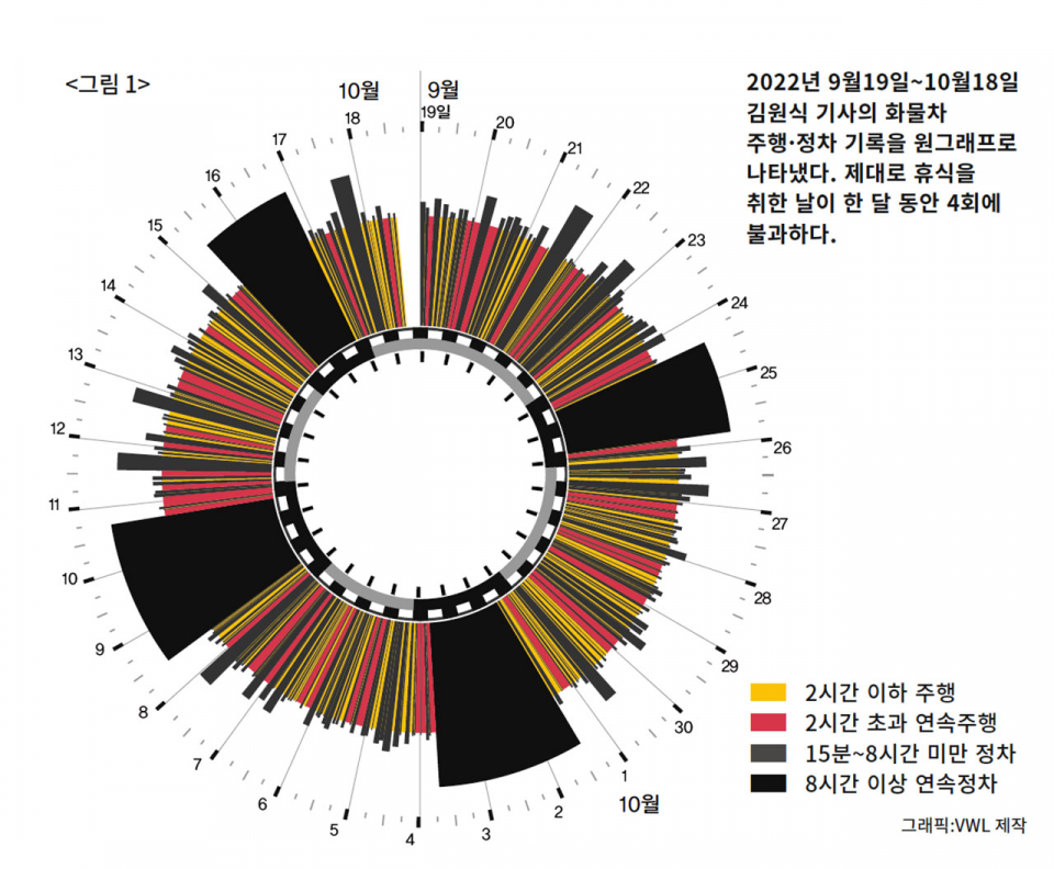 이 원그래프들은 각각 화물차 한 대의 한 달 치 DTG(디지털 운행기록장치) 기록을 시각화한 이미지들이다. 노란색과 빨간색은 주행시간, 검은색과 회색은 휴식 혹은 정차 시간이다. 동그라미 하나가 화물차 운전자 한 사람의 한 달 시간표라고도 볼 수 있다.데이터 자료:한국교통안전공단 / 데이터 분석 및 시각화:VWL교통안전법 제55조에 따라 화물차 등 사업용 차량은 DTG를 장착해야 한다. 수집된 운행기록 자료는 지방자치단체를 통해 한국교통안전공단에 제출하게 되어 있다. 교통정책을 연구하는 한상진 서울대 환경대학원 교수와 데이터 분석·시각화 전문가인 김승범 VWL 소장은 한국교통안전공단으로부터 화물차 5만9296대의 한 달 치(2022년 4월) DTG 데이터를 제공받았다. 이 가운데 데이터 검수를 거친 3만7892대 DTG 샘플을 분석 대상으로 삼아, 화물차 운전자들의 노동시간과 공간을 분석했다. 한국교통연구원이 발간하는 〈물류브리프〉 11월호에 실린 연구 보고서 ‘화물차 운전시간 총량 제한이 필요한 이유’에 그 전반적 내용이 실렸다.