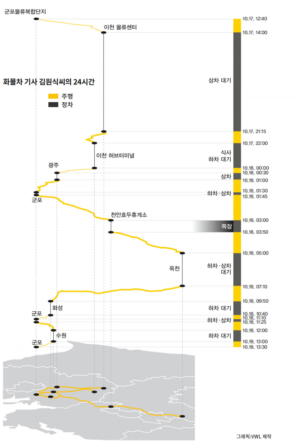 일정이 늦어진 건 김씨 탓이 아니다. 김씨가 이날 화물차에 시동을 걸고 일을 시작한 시각은 12시간 전인 10월17일 정오께. 운송 주선업체(화주의 일감을 받아 일정한 수수료를 떼고 화물차 기사들에게 연결해주는 업체)에서 배차 일정을 하나둘 띄우기 시작했다. 김씨의 첫 운행 일정은 경기도 이천시 한 물류센터에서 짐을 실어(상차) 30분 거리의 허브터미널에서 짐을 내리는(하차) 것이다. 그 뒤 경기도 광주에서 군포, 군포에서 충북 옥천을 오가며 화물 상·하차를 완료해야 한다. 두 일정 각각 오후 4시, 오후 10시30분까지 와달라는 요청이 떨어졌다. 김씨는 낮 12시40분에 일찌감치 군포물류복합단지 주차장에서 차를 빼, 오후 2시부터 첫 상차지에서 대기를 시작했다.
