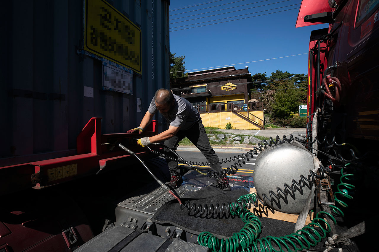 경기도 화성시 한 물류센터 인근 도로에서 컨테이너 화물칸을 연결 중인 김원식씨. ⓒ시사IN 이명익김씨 같은 화물차 기사들의 노동은 마치 벌칙 게임과도 같다. 빡빡하게 제한된 시간과 공간의 범위 속에서 조금이라도 이탈되면 바로 벌을 받는다. 10월18일 오전 10시, 밤을 새우고 도착한 네 번째 하차지 인근에서 김씨는 안절부절못하고 주위를 살피며 운전석에 탔다가 내리기를 반복했다. 물류센터 주차장이 꽉 차 인근 국도변에서 하차 대기를 하던 중이었다. 주정차 단속 차량이 김씨 차를 비롯한 화물차 사이를 지나다녔다.