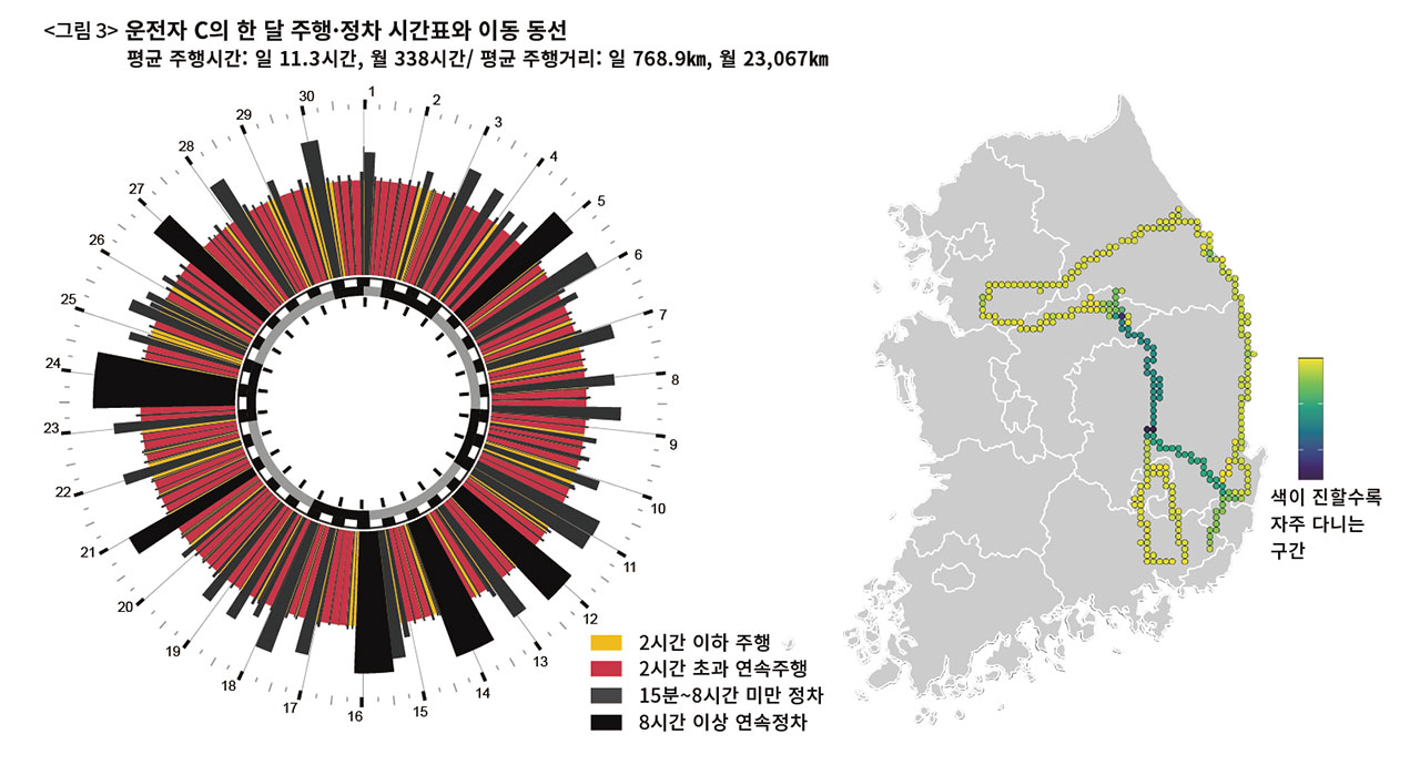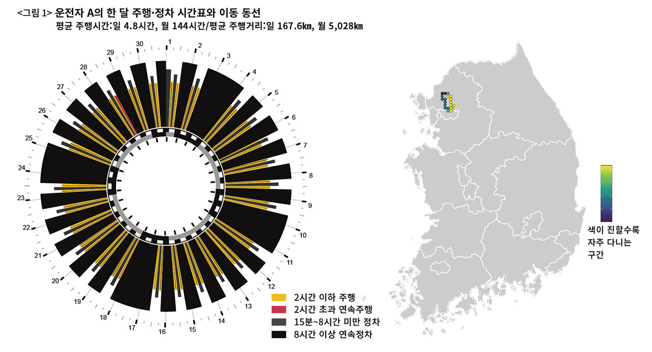 예를 들면 〈그림 1〉의 운전자 A씨와 같은 패턴이다. 이 운전자는 서울과 경기도 북부를 하루 평균 4.8시간, 167.6㎞ 주행했다. 일주일 동안 일요일(3·10·17·24일) 한 번씩은 운행을 쉬었다(검은색). 매일 8시간 이상 휴식을 취했다. 운행과 운행 사이에 15분 이상의 규칙적인 휴게시간이 관찰된다. 장시간 연속주행을 나타내는 빨간색은 거의 보이지 않는다. 비교적 안정적이고 탄탄하게 굴러갈 수 있는 바퀴 모양이다.