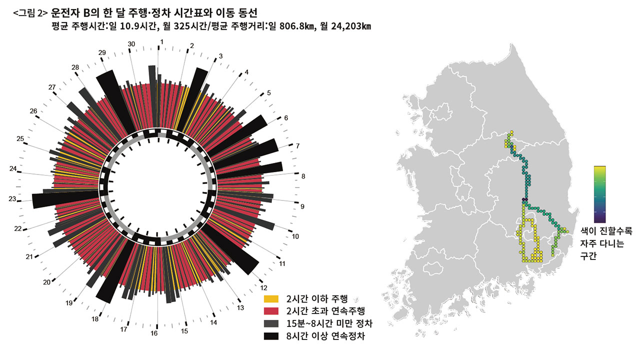 대표적인 과로 유형 몇 가지를 살펴보자. 〈그림 2〉는 화물차 운전자 B씨의 한 달 시간표와 운행 동선이다. 하루 평균 10.9시간, 806.8㎞를 달렸다. B씨의 한 달 시간표에는 8시간 이상 정차 시간을 뜻하는 검은색 부분이 겨우 여덟 번 불규칙하고 가늘게 나타나 있다. 정차하자마자 잠든다고 가정해도 B씨는 적정 수면을 취한 날이 한 달 중 최대 여덟 번에 그친다. 게다가 30일간 단 하루도 운전을 하지 않은 날이 없다. ‘무휴무’ 노동자다. 2시간 초과 연속주행 비율도 높다. B씨는 이렇게 초(超)과로 상태로 한 달간 총 325시간 동안 2만4203㎞에 이르는 전국 도로 곳곳을 달렸다.