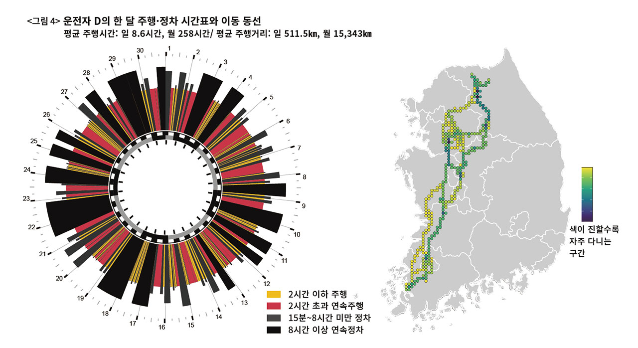 총 노동시간과 주행거리가 비교적 짧아도 문제는 남는다. 〈그림 4〉는 하루 평균 8.6시간, 511.5㎞를 운전하는 운전자 D씨의 한 달 시간표다. 운전자 B씨와 C씨에 비하면 노동강도가 양호해 보인다. 하지만 한 번 차를 몰기 시작하면 2시간 넘게 멈추지 않는 연속운행 빈도는 B·C씨 못지않게 잦다. D씨가 가장 길게 거의 쉬지 않고 운전한 시간은 4월5일 오전 5시43분부터 오후 4시41분까지다. 무려 11시간을 15분 이상 정차 없이 내내 강원도와 경기도 일대를 오갔다.