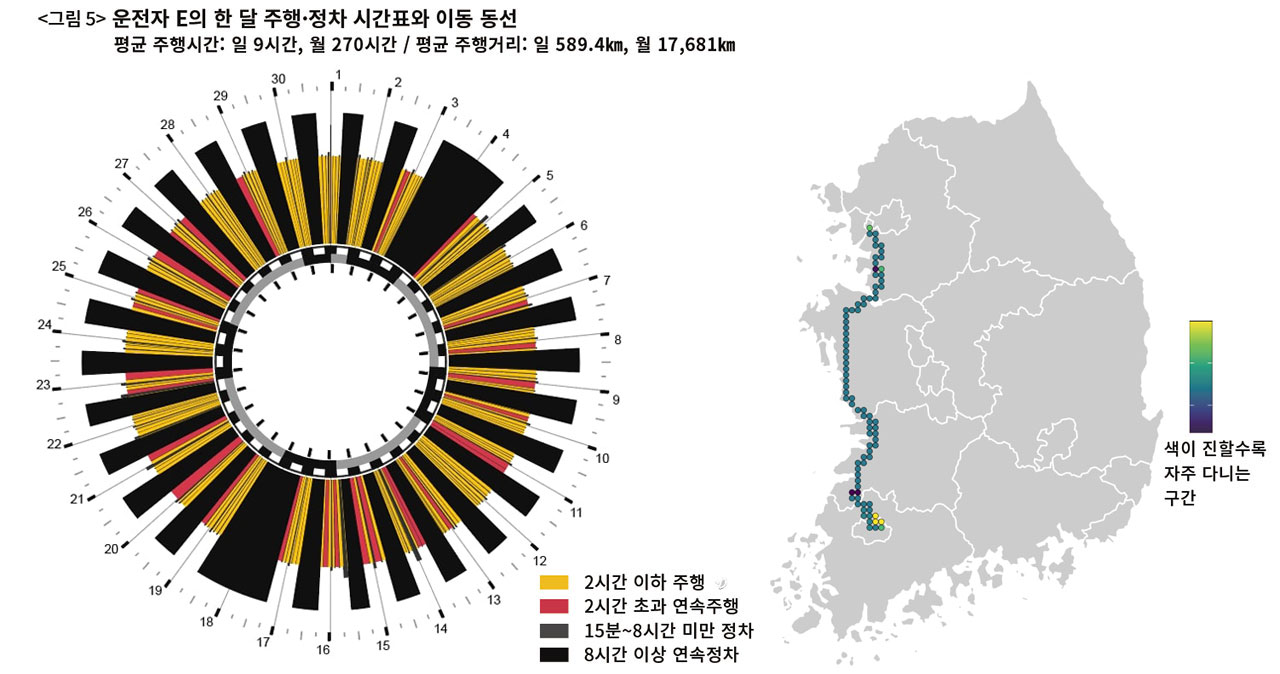 낮에 일하고 밤에 자는 일반적인 삶도 화물차 기사들에게는 쉽게 주어지지 않는다. 〈그림 5〉의 운전자 E씨의 한 달 시간표는 일견 별문제가 없어 보인다. 한 달 중 휴무가 이틀뿐이고 가끔 장시간 연속주행도 관찰되지만 그래도 꼬박꼬박 8시간 이상 연속정차(휴식)를 하고 있다.