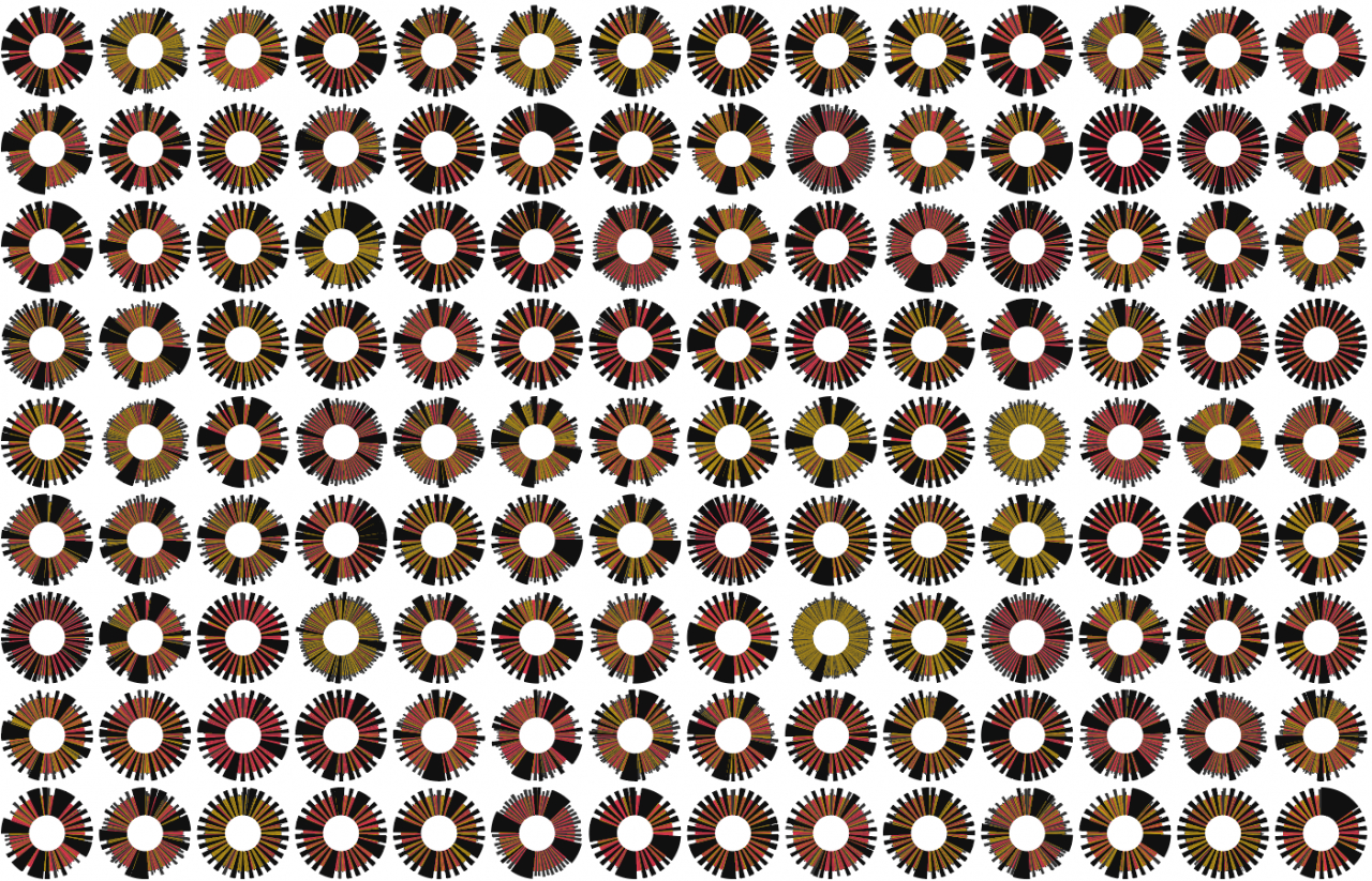 하지만 현실은 다르다. 위에 나타낸 원그래프는 각각 화물차 한 대의 한 달 치 DTG 기록을 시각화한 이미지다. 대부분이 지입(화물 차주가 운수회사에 개인 소유 차량을 등록해 일감을 받고 보수를 지급받는 제도) 형태로 운행되는 화물운송 시장 구조를 고려할 때, 동그라미 하나가 화물차 운전자 한 사람의 한 달 시간표라고도 볼 수 있다. 2022년 4월1일부터 4월30일까지 30일간 화물차(기사)의 주행과 휴식을 서로 다른 색으로 구분했다. 노란색과 빨간색은 주행시간, 검은색과 회색은 휴식 혹은 정차 시간이다.