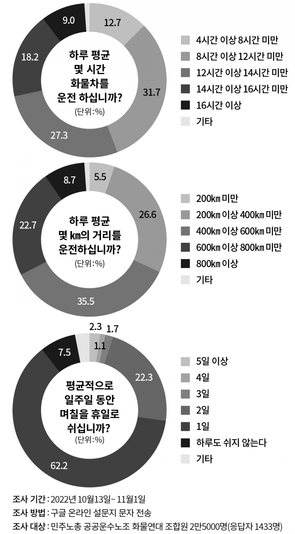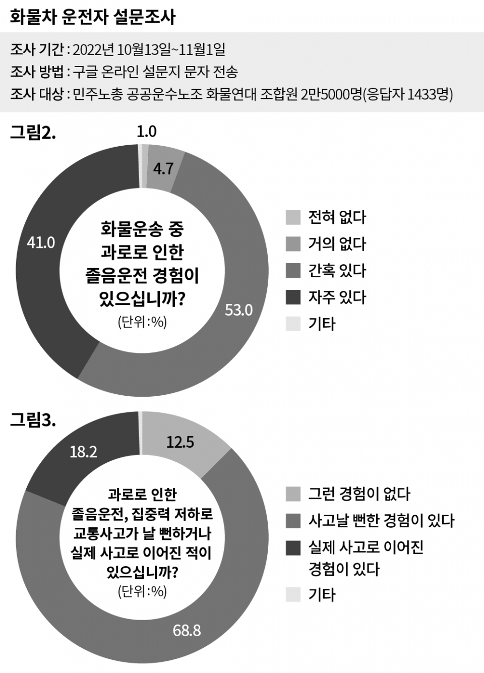 〈시사IN〉은 그 내용을 바탕으로 화물차 개별 상세 데이터를 추가로 살폈다. 더불어 민주노총 공공운수노조 화물연대본부 협조를 얻어 지난 10월13일부터 11월1일까지 화물차 기사 2만5000여 명에게 운행 형태와 휴식, 수면 시간 등에 관한 온라인 설문을 돌렸다. 화물차 기사 총 1433명이 답변을 남겼다. DTG 분석과 설문조사 응답으로 확인한 화물운송 노동자들의 노동 형태는 화물차 기사들의 휴식, 수면, 건강, 그리고 모두의 안전을 심각히 위협하고 있었다.