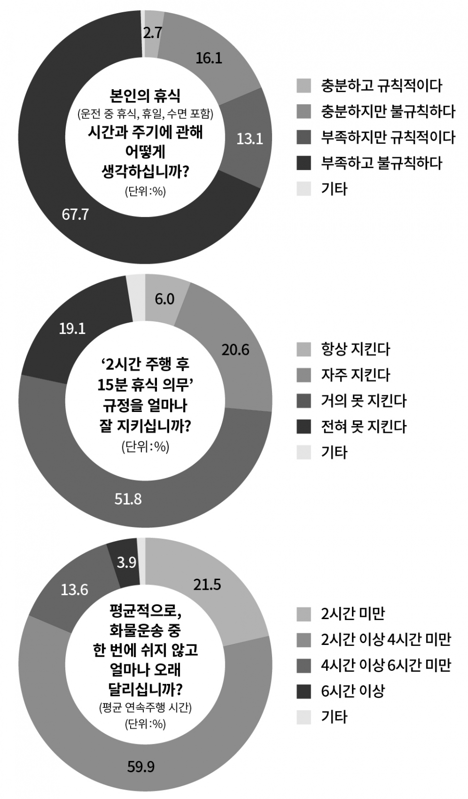 ‘2시간 운전 후 15분 이상 휴식’이 현실에서 불가능함은 화물차 기사 설문조사에서도 나타난다. 전체 응답자의 6%만이 그 규정을 ‘항상 지킨다’고 답했다. ‘자주 지킨다’는 20.6%, ‘거의 못 지킨다’와 ‘전혀 못 지킨다’는 각각 51.8%와 19.1%다. 평균 연속운행 시간을 물어보았을 때도 21.5%만이 ‘2시간 미만’이라 답했다. 77.4%가 ‘2시간 이상’, 17.5%가 ‘4시간 이상’이라 답했다. 한 번 달릴 때 6시간 이상 쭉 달린다는 응답자도 3.9% 나타났다.