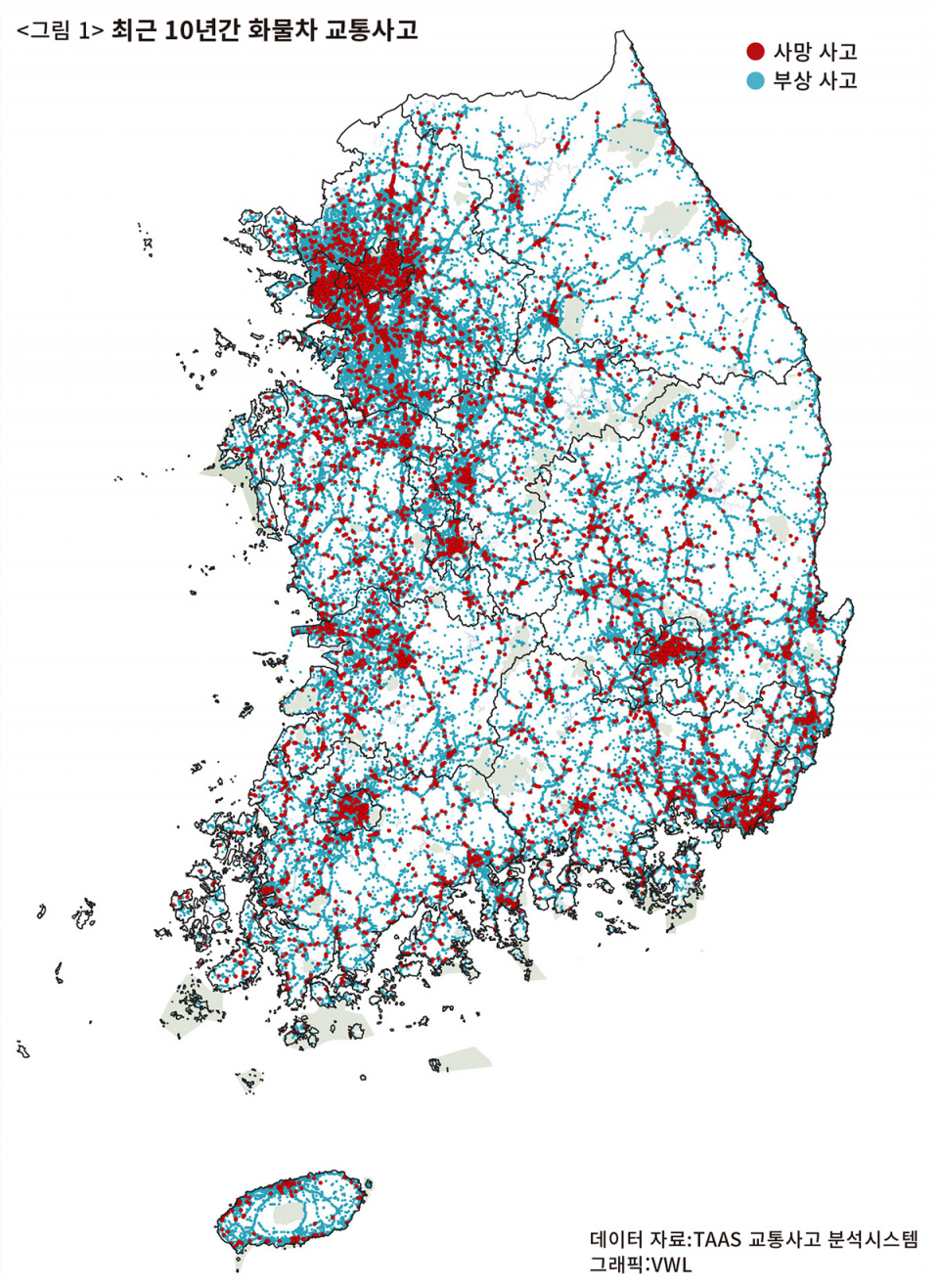 2022년 11월 첫 주에만 일어난 화물차 사고들이다. 매일 눈 뜨고 일어나면 이런 소식들이 ‘어제의 사건사고’ 단신 뉴스 속에 담겨 세상에 전해진다. 화물차 사고는 흔하다. 그리고 치명적이다. 지난 10년간 일어난 화물차 교통사고를 지도 위에 나타냈다(아래 〈그림 1〉 참조). 2012년부터 2021년까지 총 29만9446건이 발생했다. 그중 6436건이 사망사고다. 1년에 643.6건, 하루 1.8건꼴이다. 올해 상반기 전국 고속도로에서의 사망 교통사고 64.8%가 화물차에 의해 일어났다.