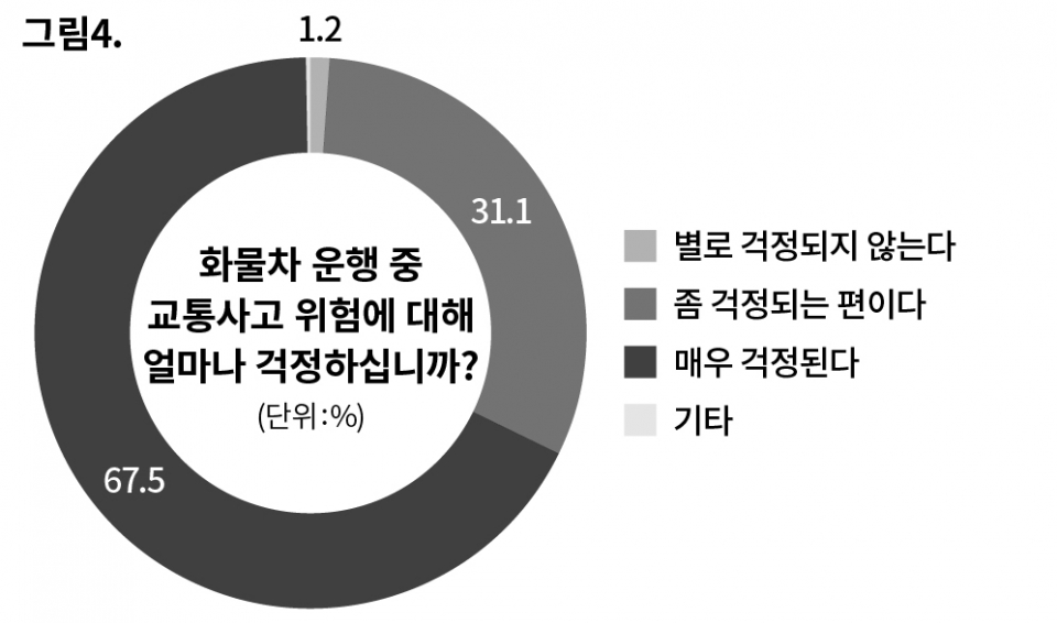 화물차 운전자들은 늘 교통사고를 두려워하며 일한다. 설문조사 응답자 98.6%가 “운행 중 교통사고가 걱정된다”라고 답했다. 67.5%는 “매우 걱정된다”라고 답했다(〈그림 4〉 참조). 그 이유를 물었을 때 많은 경우 자신의 몸이 상하는 문제보다 생계 문제를 들었다. “일을 못하게 될 경우 먹고사는 문제가 막막해짐(30대·25t 트랙터)” “사고가 나면 당장 생활을 할 수가 없고 빚만 남는 상황. 힘들지만 일을 해야 할부를 넣을 수 있는데 사고가 나면 그 할부가 고스란히 빚으로 남는다. 사고가 나면 먼저 가족을 생각해야 하는데 할부를 먼저 걱정해야 하는 현실이 안타까울 뿐이다(40대·25t 카고).”