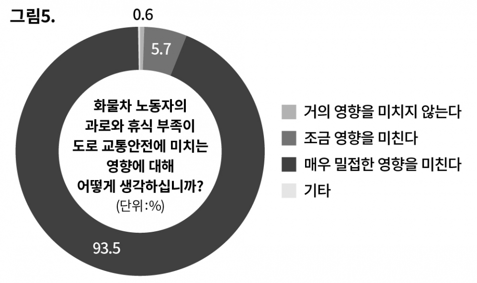 덜 일하고 더 쉬어야 안전해진다는 걸, 화물차 기사들 스스로 모르지 않는다(〈그림 5〉 참조). 무엇이 바뀌어야 그게 가능해질지도 당사자들이 잘 알고 있다. “안전운임제로 일정 수입이 보장되면 휴식시간이 늘어날 것이고 휴식시간이 늘어나면 건강과 안전은 따라올 것이다(40대·25t 카고)” “전 차종 화물 노동자를 노동법 테두리 안으로 넣어야(50대·25t 트럭)” “현재 대한민국 물류운송 시스템은 적은 운임으로 정해진 시간에 여러 횟수로 운송해 매출을 올리는 시스템이다. 기업이 영업이익을 창출하기에는 합리적인 시스템이지만, 그 속에서 사람 목숨이 좌지우지되고 있다. 근본적인 시스템이 바뀌어야 화물차 노동자와 도로 위를 같이 달리는 국민의 생명이 지켜질 수 있다”.