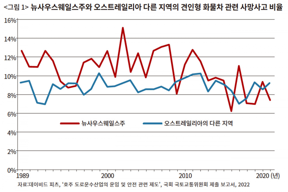 1979년부터 안전운임제를 시행한 오스트레일리아 뉴사우스웨일스주에서 1989년부터 2021년까지 전체 도로 사망사고 중에서 견인형 화물차와 관련된 사망사고의 비율이 꾸준히 줄었다. 안전운임제를 시행하지 않은 오스트레일리아 내 다른 지역에서는 그렇지 않았다(〈그림 1〉 참조). 이는 다른 요인으로는 설명되지 않으며, 안전운임제가 205명이 넘는 생명을 구한 것으로 분석되었다. 뉴사우스웨일스주 노사관계위원회는 최근 경차를 사용하는 아마존 플렉스 등 새로운 유형의 플랫폼 배달 노동자들에게도 이 제도를 확대하기로 했다(데이비드 피츠, ‘호주 도로운수산업의 운임 및 안전 관련 제도’, 국회 국토교통위원회 제출 보고서, 2022).