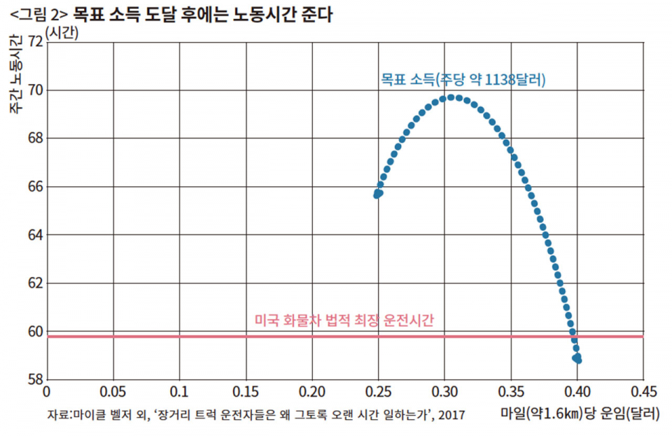 미국 화물차 운전자들의 데이터를 분석한 연구에 따르면, 운전자들은 일정 목표 소득, 대략 주 1138달러(월 약 650만원)에 도달할 때까지는 노동시간을 늘린다(〈그림 2〉 참조). 그 이후에야 일을 줄이고 휴식을 취한다(마이클 벨저 외, ‘장거리 트럭 운전자들은 왜 그토록 오랜 시간 일하는가’, 2017). 논문은 이렇게 쓴다. “장거리 운전자들은 그들의 모든 근무시간에 대한 보수를 받지 않는 한 근무시간을 줄일 경제적 유인이 없을 것이다.”