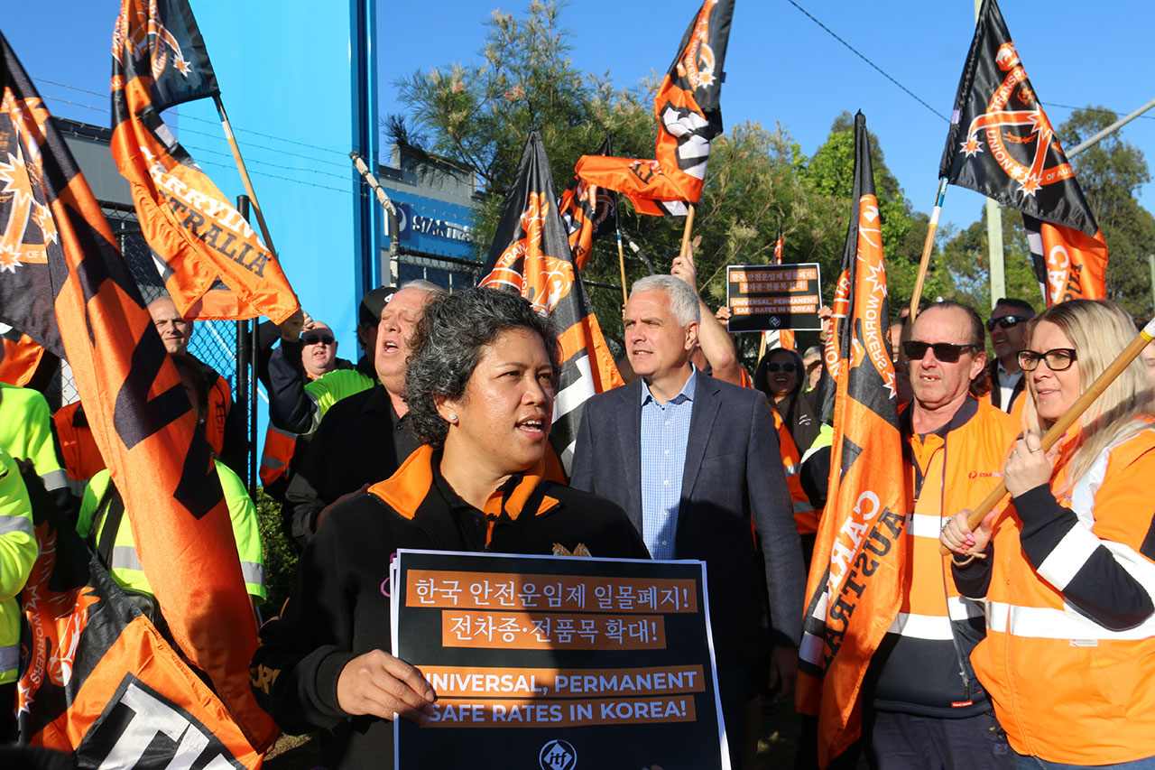 2021년 10월 오스트레일리아 운수노조의 파업 현장에서 한 참가자가 한국 내 안전운임제 확대를 요구하는 팻말을 들고 있다. ⓒ임월산 제공‘책임의 사슬 원칙’이 생명을 지킨다