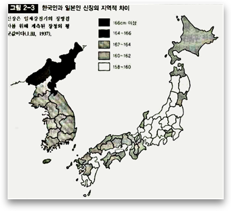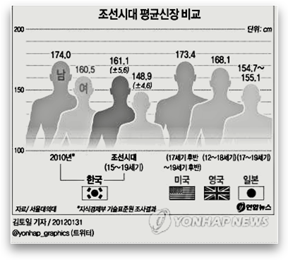 꾸준히 키가 성장을 해오다 일제시대 병탄을 기점으로 일제의 통치하에 출생한 남자들의 경우 지속적으로 평균 신장이 줄어들며 일본의 통치가 15년이 지난 이후 출생자들의 경우 대한제국 시절 출생자보다 평균 6센티 이상 오히려 줄어드는 지경에 이름