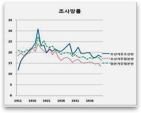 의학기술이 발전하고 근대화가 진행 될수록 사망률이 줄어야 하는데 일제시대 평균 사망률은 대한제국 시절 보다 3배이상 증가하며 앞도적으로 사망률이 높아짐.