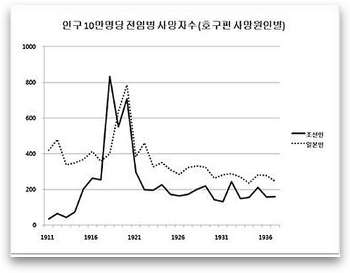 위생문제에 따른 전염병에 의한 평균 사망률은 대한제국시절 부터 이미 일본인이 압도적으로 높았고 일제시대 기간 내내 항상 일본인이 더 높았음.