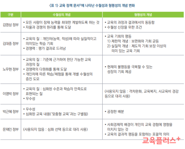 형평성의 개념은 교육 기회나 재정 배분, 과정에서의 동등한 참여, 교육 결과 등 시기별로 강조점을 두고 변화되어 왔고, 수월성의 개념은 대체로 교육에서의 질 추구와 학생의 학업성취로 드러나는 우수성의 의미를 중심으로 사용됐다는 설명이다.