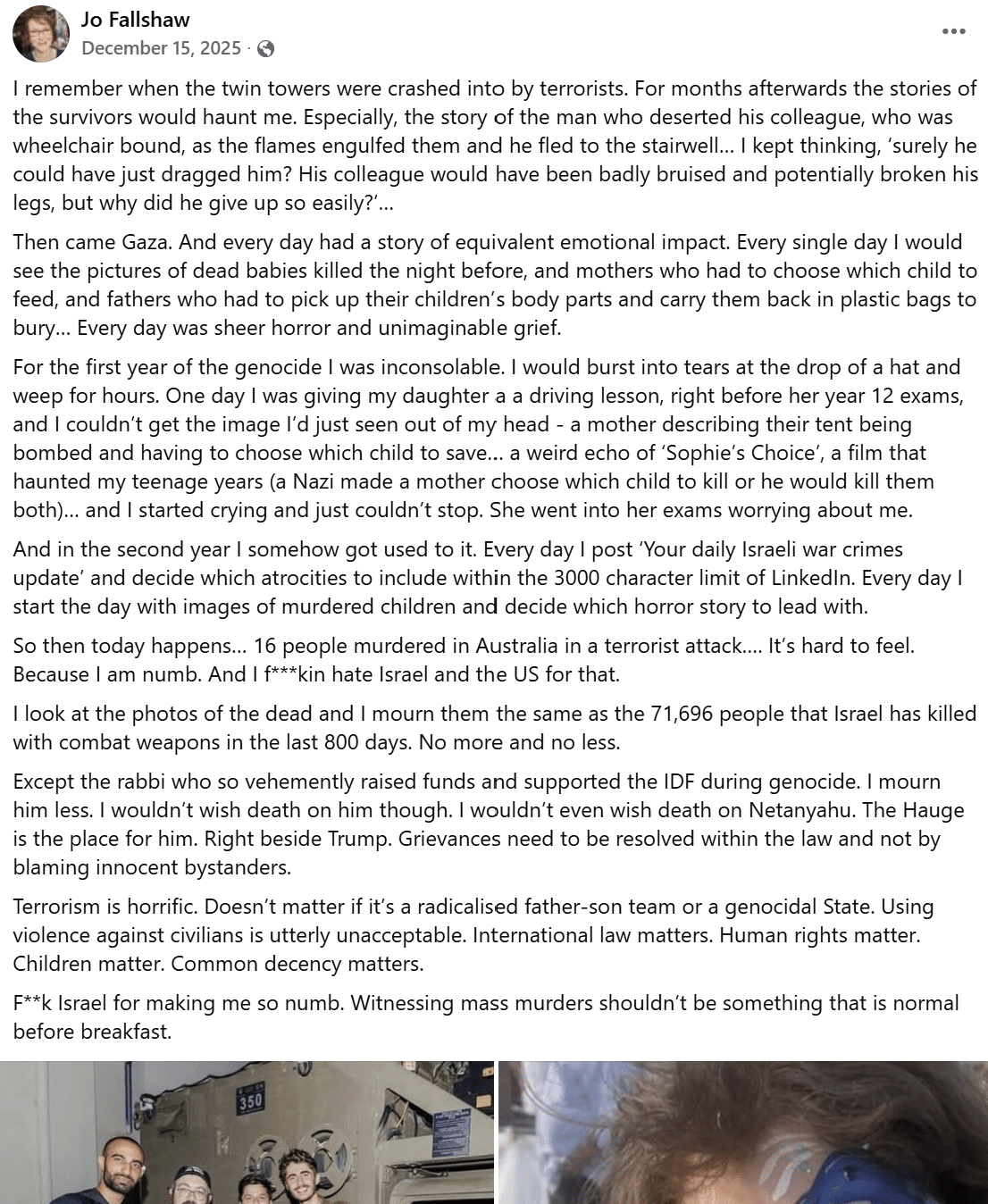 This woman hates Israel so much, her reaction to the Bondi massacre was “f*ck Israel”:
