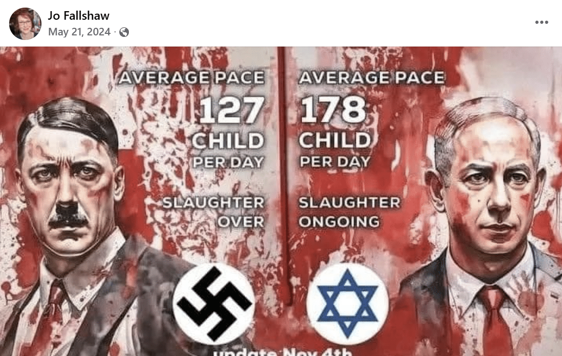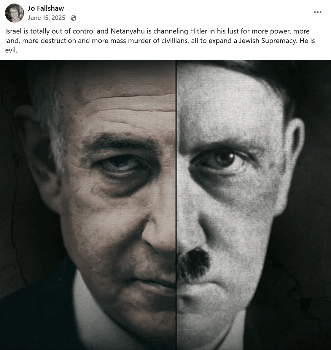 Like when Jo compares us to the Nazis, a highly hurtful and offensive comparison in contravention of the IHRA Working Definition of Antisemitism: