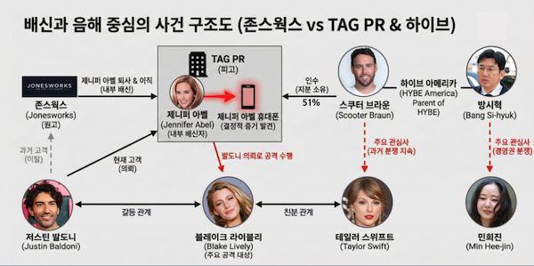 비방 전문 PR 회사 인수: 하이브가 스쿠터 브라운과 관련된 TAG PR이라는 회사를 인수하여 자사 아티스트인 뉴진스와 민희진 전 대표를 공격하는 역바이럴을 수행했다는 의혹입니다