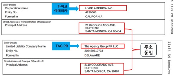 <뉴탐사>와 <한겨레>, 기타 외신들의 보도에 따르면 하이브가 TAG PR을 인수한 시기는 24년 8월 1일, 즉 민희진 대표가 하이브에 맞서 기자간담회를 열고 적극적으로 언론에 대응을 하면서 여론의 흐름이 바뀐 다음이었다. 한 달 간 TAG PR과 그림을 그렸는지, 하이브는 2024년 8월 27일 민희진 대표를 해임한다. 이는 뉴진스 멤버들이 9월 11일 민희진 대표를 복귀시키라고 라이브 방송을 한 후 이에 관련된 자료를 요구한 빌보드의 제프 벤자민 기자에게 하이브가 TAG PR의 자료를 넘긴 것으로 확인할 수 있다고 <뉴탐사>는 보도한다.