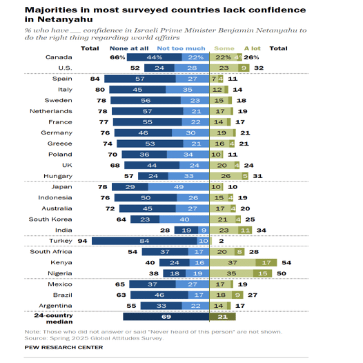 일본인 이스라엘, 네타냐후 총리에 대한 호감도는 세계 최저 수준 - 최신 퓨 리서치 센터의 여론 조사에서