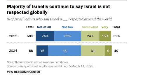 이스라엘 사람들도 이스라엘이 세상에서 경의를 받고 있다고 생각하지 않는다.이스라엘에서 무기를 이전한 무장 집단은 이스라엘 군이 지배하는 지역에서 활동하고, 라파에 거주하는 베드윈 일족 출신의 야셀 아부 샤바브가 이끌고 있다고 되어 가자 지구에서는 인도적 지원 물자의 약탈에 관여해 온 것으로 알려져 있다. 이 샤바브가 이끄는 범죄집단은 약 100명으로 '이슬람국(IS)'이라고도 통하고 있다고 보도되고 있다. 지원물자를 약탈한 샤바브 그룹의 멤버를 추적한 가자지구 경찰 아사드 카팔나는 5월 2일 이스라엘군에 의해 사살됐다. 하마스 전투원은 1월까지 원조 트럭을 약탈했다고 여겨지는 아부 샤바브의 적어도 24명의 수하를 살해했다고 한다. 네타니야프 총리가 노리고 있는 것은 이러한 팔레스타인인끼리의 죽음이다.